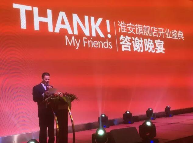 當天晚宴上,圣德保淮安經銷商王總發表了激情澎湃的《擁抱未來,堅定前行》主題演講,王總在演講中表揚并高度認同開業期間淮安家人們所獲得的成績,同時表示,圣德保淮安旗艦店才剛剛開啟篇章,需要每一位淮安圣德保人爭做智勇雙全的戰士共創新輝煌!最后,王總攜手全體淮安圣德保家人們舉杯祝福淮安圣德保明天更好!!!