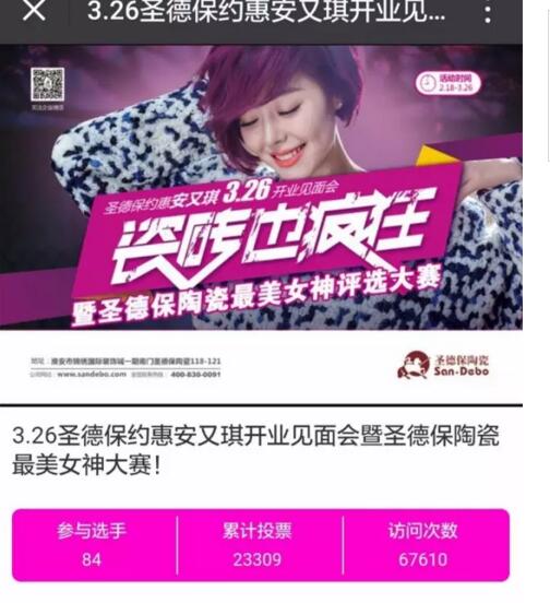 “瓷磚也瘋狂”蘇北聯動,圣德保微信平臺推出“3.8女神節大賽”專題活動,創高達9萬訪問量,累計投票次數達3萬多票,引爆終端活動。小投入,大產出;新模式,快傳播,領秀同行。