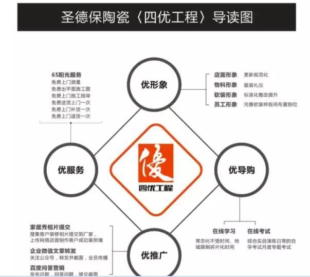 2017年,圣德保圣德保再度升級三優工程,增加“優服務”體驗,推出免費上門測量、免費出平面施工圖、免費上門施工指導、免費送貨上門一次、免費上門補貨一次、免費上門退貨一次等6S陽光無憂終端服務體系,從產品層面優化到終端銷售體驗一體化標準體系,為消費者提供360°全方位服務。確保產品的質量以及服務的及時性,為消費者徹底解決瓷磚選購及裝修無憂等系列問題,最大限度的為全國范圍的消費者提供最完善、最系統化的品牌服務與體驗。