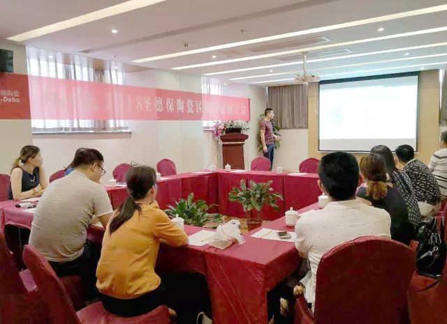 (宜春站,圣德保陶瓷銷售總經理嚴偉才在會上分析市場動態,講解品牌發展規劃)