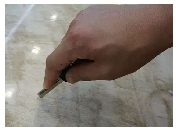 用金屬鑰匙尖端在磚面來回滑刮,瓷磚表面看不到任何刮痕,光潔的釉面也沒有被磨損。