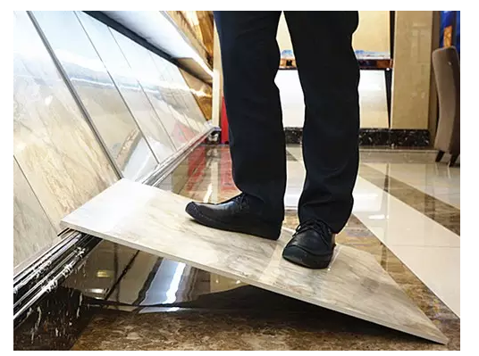 為測試勞拉利卡石材的承重能力,小編將瓷磚傾斜30度角懸立在地面,并邀請(qǐng)一位重約160斤的成年男性站在瓷磚中部,利卡石材依然完好無損,其承重能力超強(qiáng)。