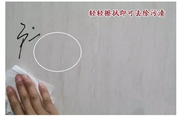 評(píng)測員現(xiàn)場用馬克筆在瓷磚表面直接寫字,淺色表面容易顯污,但用抹布配以少量清潔劑輕輕擦拭二十秒,便恢復(fù)如初光潔。